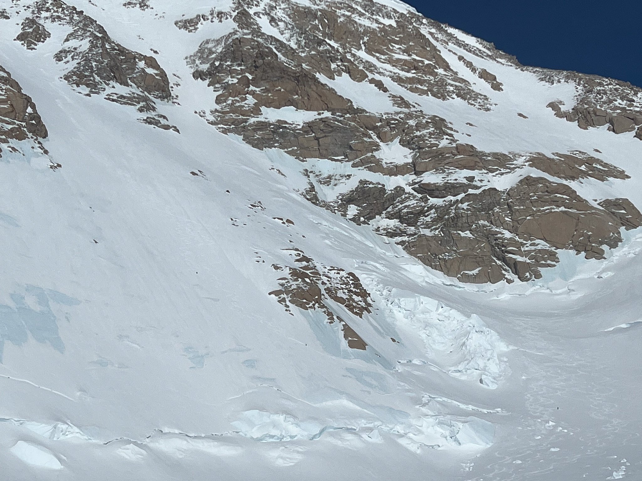 World-class, aspirational ski terrain on Denali. Find the three skier dots threading through the ice patches. It might not look this icy when you are there, but that ice is surely underfoot. No matter what it looks like. This is serious climbing terrain; we need serious climbing tools.